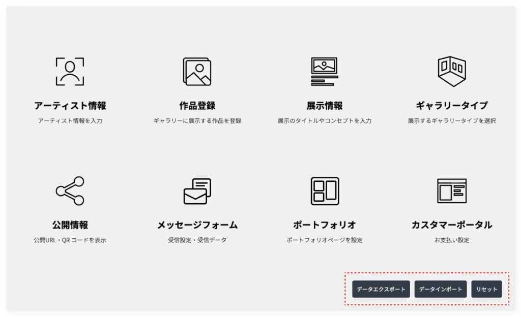 エクスポートした作品登録・ギャラリー設定データは他のユーザーの環境へもインポートできるので、アーティストのギャラリー構築の代行、といった作業が可能になります。